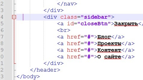 Внутри тега header нужно сделать Div с классом, внутри этого дива сделать ссылку с атрибутом id, дать Id имя и сделать отступ через тег br. И сделать ссылки под кнопки, которые будут пунктами выдвижного меню. Код <div class="sidebar"> <a id="closeBtn">Закрыть</a> /* Кнопка закрыть <br> /* Отступ кнопок от кнопки Закрыть <a href="#">Блог</a> /* кнопка Блог <a href="#">Проекты</a> /* кнопка Проекты <a href="#">Контент</a> /* кнопка Контент <a href="#">О сайте</a> /* кнопка О сайте...