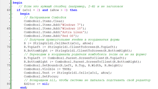 В Delphi и Lazarus, когда вы используете таблицы для ввода-вывода данных, иногда (впрочем, довольно часто) необходимо, чтобы в каком-то столбце была возможность не просто вводить текст, а выбирать значение из списка. При работе с базами данных это можно сделать, например, с помощью TDBGrid с полем lookup. Но, если вы не используете базу данных, а таблица вам нужна для отображения каких-то временных данных или для выгрузки в файл (загрузки из файла), то проще использовать TStringGrid. Однако в таблице этого вида нет стандартных возможностей сделать ячейку с выпадающим списком...