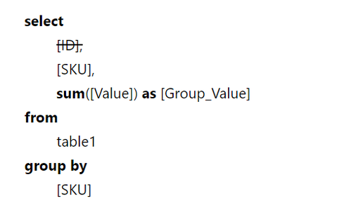 В одном из прошлых постов (чтобы ознакомиться, перейдите по ссылке) я опубликовал задачу для начинающих. В этой статье разберем ее решение по шагам на примере SQL Server 2019. Таблицу "было" назовем "Table1", т.к. все названия в базах данных рекомендуется называть латиницей. Далее пойдем по шагам. Шаг 1 Для начала напишем простое извлечение всех строк из таблицы. Шаг 2 Понимая, что в данной задаче нам нужно сгруппировать таблицу по SKU и агрегировать столбец Value, модифицируем запрос и удаляем лишние данные...