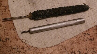 Друзья, у многих из вас на дачах и в квартирах (кто успел установить) стоят электрические водонагреватели, в народе часто именуемые бойлерами. Так вот: не повторяйте моих ошибок и не забывайте менять аноды. История. Через полтора года после покупки этот красавец перестал работать - автомат УЗО его отключал, потому что ток шёл на корпус водонагревателя. После вскрытия (2 фото, листай вбок) обнаружилось, что магниевые аноды уже никуда не годятся, а ТЭН прогнил и отдает ток в воду. Вот так выглядел анод через полтора года использования...