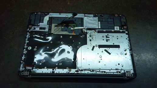 Залитая клавиатура – один из самых популярных поводов для обращения в сервис по ремонту ноутбуков. Вскрываем, осматриваем – повезло. Конструкция этой модели предусматривает защиту материнской платы от залития через клавиатуру, так что дополнительных работ не потребуется...