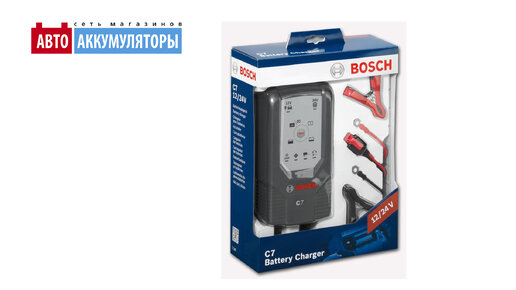 Представляем зарядное устройство Bosch С7 12/24V 7/3,5A Комплектация включает в себя: - зарядное устройство, - крепёжный крючок, - две съёмных соединительных клеммы (красная "+", чёрная "-"), - разборный зарядный кабель с предохранителем, - инструкцию по эксплуатации. Возможности устройства: - 6 режимов работы (возможность заряжать открытые и закрытые аккумуляторы), - предназначен для зарядки легковых автомобилей (напряжение 12 В, ёмкостью от 14 Ач до 230 Ач), - идеален для зарядки АКБ грузовых автомобилей и спецтехники (напряжение 24 В, ёмкостью от 14 Ач до 120 Ач)...