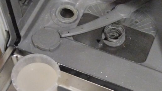 Да, так бывает, насыпаешь специальную соль в отсек посудомойки и забываешь закрыть крышку. Потом еще несколько раз посудомойка поработает и уже когда обнаруживаешь, что открыта крышка, то в отсеке для соли уже скопилась вся грязная и жирная вода. Но не всё так плохо. Самое главное, как можно быстрее принять меры по очистке специального отсека. Отключаем посудомойку от сети. Открываем дверь полностью и вытаскиваем корзины для посуды, чтобы не мешались. Видим, что отсек для соли полностью заполнен грязной водицей...