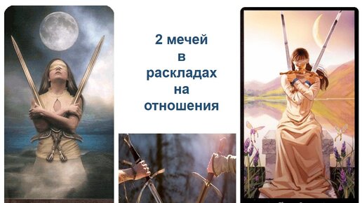 Здравствуйте! В большинстве колод на аркане 2 мечей изображена сидящая спиной к воде женщина с завязанными глазами, которая скрестила перед собой два меча, символизирующих собой два выбора, два противоположных мнения. Закрытая поза говорит о поиске правильного решения с помощью беспристрастной, очищенной от лишних эмоций, оценки ситуации. Женщина намеренно отвернулась от чувственной сферы (вода и луна) или, по крайней мере, подавила свои чувства на то время, пока находится в состоянии выбора. Что...