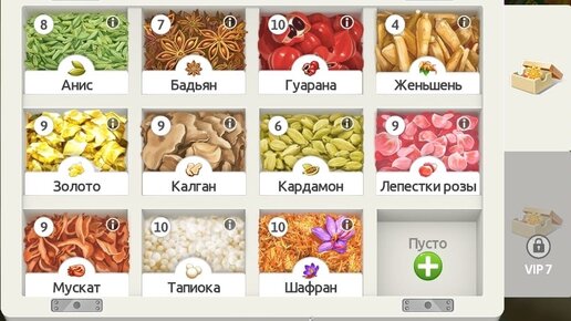 Привет! Сегодня я подробно расскажу про самый большой вид заработка. Специи. На пятом уровне в магазине появляется Коробка для специй. И мы получаем свои первые простые специи: это анис и роза. В коробке первые три ячейки нам достаются бесплатно. Поэтому мы можем накопить любые 3 специи по 10 штук. Это максимум для одной ячейки. (одна ячейка = 10 штук) Остальные 9 ящичков придётся покупать за бриллианты. 4 полочка – за 9 бриллиантов 5 полочка – за 19 бриллиантов 6 полочка – за 49 бриллиантов А остальные 6 ящиков за 199 бриллиантов...