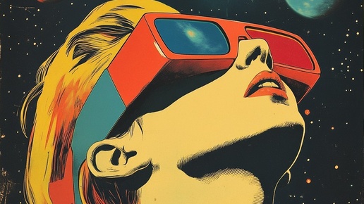 Создано на основе запроса: retro-futuristic image of a young person wearing red and cyan lens anaglyph glasses, outer space background, in the style of a 1950's offset print comic book --- Автоперевод: Ретро-футуристический образ молодого человека, одетого в красные и голубую линзу...