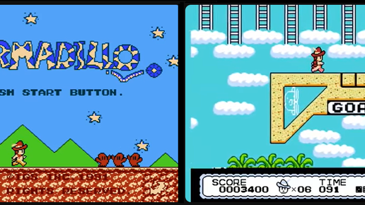 Малоизвестные игры Денди - Часть вторая ( Нинтендо 8 Бит ) ... Armadillo : платформер, выпущенный IGS в 1991 году … Игрок управляет жёлтым броненосцем в красной шляпе по имени Билли Панцирь. По сюжету игры -Билли Шелл и его девушка Шерил счастливо живут в Техасе. Однажды Шерил похищает банда «Чёрная фасоль», и он теперь должен её спасти. Действие игры происходит в сатирической версии Соединённых Штатов, где козлы работают барменами, а марсиане живут среди людей … Между уровнями игрок перемещается по экрану с картой, как в Super Mario Bros...