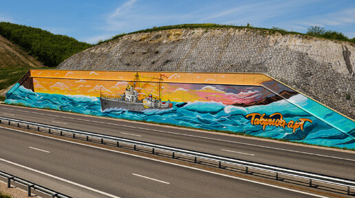 Художники арт-кластера «Таврида» создали новый стрит-арт-объект, посвященный Победе в Великой Отечественной войне. Грандиозный мурал украсил трассу «Таврида» рядом с Севастополем. Резиденты арт-кластера – художники команды Desarte365 – создали тематический мурал по мотивам картины «Гвардейский тральщик «Защитник Т-411» Вячеслава Овчинникова, одного из ведущих художников-маринистов ВМФ при Центральном военно-морском музее. Над масштабным арт-объектом в течение 97 часов трудилось 6 художников. На создание мурала площадью 600 квадратных метров ушло 205 литров краски...