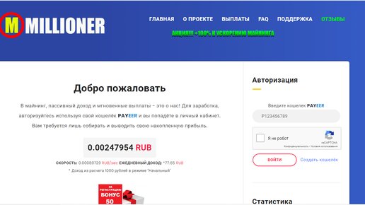 Тип заработка: Заработок реализован на майнинге Адрес сайта: https://millioner-nps.ru/ Пополнение: Отсутствует (не обязательное). Описание: Организаторы данного проекта позиционируют свой сайт, как заработок при использовании майнинга. То есть вы покупаете скорость майнинга, вследствие чего увеличивается и ежесуточная прибыль. Чем вы больше и чаще покупаете, тем быстрее растёт ваша прибыль. Также они утверждают, что заработок возможен без вложений. В чём-то они конечно правы, но на раскрутку и выход на приемлемую прибыль потребуется очень много времени...