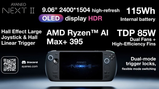 AYANEO представила игровую портативную консоль NEXT 2 с процессором AMD Ryzen AI Max+ 395. Устройство оснащено 9,06-дюймовым OLED-дисплеем 2400×1504 пикселей с HDR и пиковыми 1100 нит яркости, поддержкой частоты 60–165 Гц и большим аккумулятором 115 Вт/ч., с которым правда на борт самолёта не пустят (если узнают объем)...