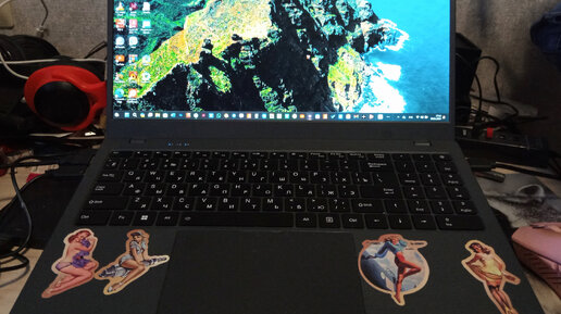 На фото перед статьёй собственно рассматриваемый ноутбук. Наклейки по бокам тачпада наклеил я. К качеству фото не особо придирайтесь, так как фото сделано камерой одного бюджетного смартфона. И так, обзор этого ноутбука. Я пользуюсь этим ноутбуком уже чуть больше двух месяцев. И этого времени вполне достаточно для полного изучения ноутбука. Корпус у него полностью пластиковый, но довольно хорошо смотрится. Размер ноутбука не маленький из-за довольно большого экрана с диагональю 15,6 дюйма. Но об экране подробно дальше...