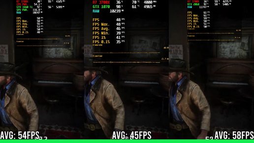 Эксперты YouTube-канала Hardware Tested протестировали в 10 современных играх в 1080p видеокарты GTX 1660 Ti, GTX 1070 и RTX 2060. Red Dead Redemption 2 шла с ультра-пресетом. Средняя частота кадров в ней составляла 54 к/с (с GTX 1660 Ti), 45 к/с (с GTX 1070), 58 к/с (с RTX 2060), максимальная - 61 к/с, 50 к/с и 64 к/с соответственно, минимальная - 50 к/с, 39 к/с и 54 к/с соответственно. Игра Rainbow Six Siege запускалась на высоких настройках графики. Средний FPS в ней равнялся 293 к/с (GTX 1660...