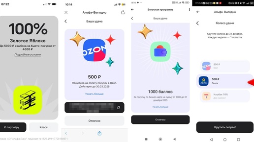 Начало недели - пора собирать плюшки от Альфы⬇️: 🟥 По обычным картам Альфа-Банка не забываем крутить барабан на Золотом Яблоке — до 100% кэшбэка. Ищем по слову «Золотое яблоко». У меня 25% на покупки от 3000. FAQ | Правила Сегодня в течении дня должны появиться и другие барабаны - ждем, напишу. 🟥 По карте Альфа-Бизнеса сегодня вновь можно крутить колесо удачи. Заходим в Сервисы → Альфа Выгодно → "Колесо удачи". У меня выпал Ozon на 500 рублей. 🟥 Новенькие клиенты Альфа-бизнеса, которые открыли...