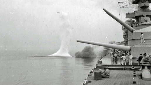 German Scharnhorst battleship of the Nazi Kriegsmarine in a military campaign. View from the deck to a sea battle against an American transport ship.