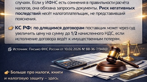 ФНС направила обзор ключевых выводов Конституционного и Верховного судов по налоговым спорам за IV квартал 2025 года. 📌 ВС РФ: при камеральной проверке инспекция вправе истребовать документы не только в прямо указанных в НК РФ случаях. Если у ИФНС есть сомнения в правильности расчёта налогов, она обязана запросить документы. Риск негативных последствий несёт налогоплательщик, не представивший пояснения...