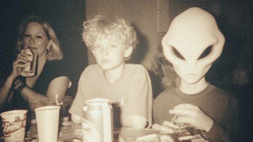 Создано на основе запроса: the guest alien being from Nibiru, drunk, first day of school, 1998 family candid photo, nostalgia, disposable