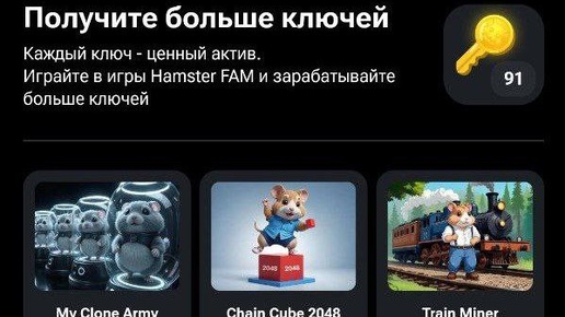 Активируй ключи в Hamster Kombat от My Clone Army, Chain Cube 2048, Train Miner и Bike Ride 3D