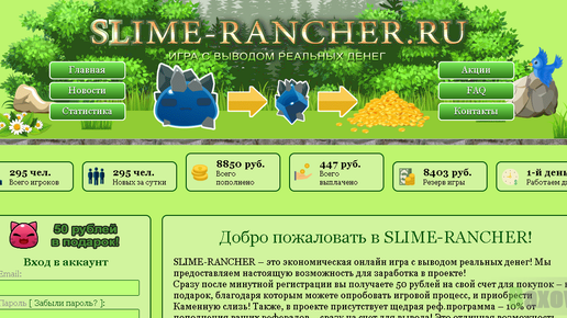 Ресурс Slime Rancher - это экономическая онлайн игра с выводом реальных денег, администрация которой предлагает вкладывать деньги в виртуальных персонажей, а именно различные виды "веселой" слизи, которая якобы и будет приносить доход. Всем этим товарищам не привыкать обманывать пользователей, так что они не гнушаются создавать откровенно мусорные проекты, у которых нет даже банального раздела Правила. Но зато обещаний полно, плюс еще и заманух целая куча. И потому нужно якобы поскорее сюда вкладывать деньги...
