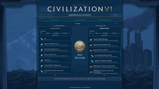 Решил поделиться списком модов, которые я использую для игры с ИИ в Civilization VI. Я провел в игре сотни часов и эти моды помогли сделать игру более удобной, понятной и чуть более разнообразной. Изображения взяты со страниц модов из мастерской Steam. 1. Enhanced Mod Manager - экран менеджмента модов. 2. Quick Start - отключает вступительные логотипы при запуске игры. 3. Game and mods - Russian translations - исправляет ошибки официального перевода, отображение заглавных букв, а также добавляет перевод для более 50 модов...