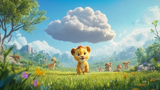 Создано на основе запроса: 3d cartoon animation The lion cub is playing happily with friends (other small animals) in a sunny meadow. Suddenly, a big, grey dark worry cloud appears in the sky, casting a shadow over everything. --- Автоперевод: 3D -мультипликационная анимация...