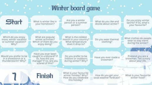 В своём телеграм-канале делюсь с вами board game с вопросами на тему winter ❄️ Выложила два варианта: интерактивный pptx (с возможностью кликнуть на кубик и получить число) и неинтерактивный pdf (который можно перенести на доску miro, например)...
