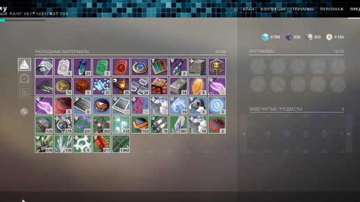 В прошлой статье мы разобрались с частью инвентаря "Персонаж". Сегодня мы продолжим разбор, но уже в других вкладках. Предметы: Из названия следует, что в этой вкладке должны пылиться какие-то вещи. Так и есть. В "Предметах" хранятся расходные материалы, ресурсы, энграммы, шейдеры, скины, иногда поручения. "Предметы" условно можно поделить на 5 секций: 1. Расходные материалы: Расходные материалы представляют главную часть инвентаря. Здесь вы можете активировать имеющийся баф, посмотреть кол-во тех или иных ресурсов,настроить карточку испытаний...