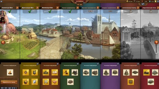 На текущий момент в игре представлено 20 эпох, по которым нам предлагают развиваться. Из них одна начальная, из которой игрок уходит в первые же минуты, называется она Каменный век. И одна самая последняя, она сейчас находится в разработке и для игры не доступна...