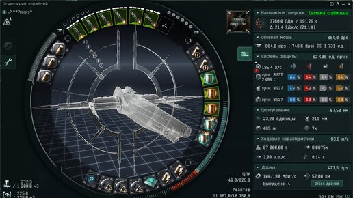 Линкор Praxis вы не найдёте на схеме кораблей, но он есть.... Купить его можно в торговой системе, обычно есть в свободной продаже также в контрактах часто продаются уже оснащённые корабли Особенность этого корабля то что он не требует прокачки и доступен с первого дня игры. Корабль универсальный, обладает бонусами на ракеты, орудия и дронов. Благодаря универсальности и доступности Praxis часто используется в PVE. Один из фитов предлагается на скриншоте ниже Корабль несёт два вида оружия - скорострельные тяжёлые ракеты и дроны...