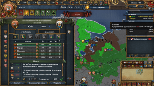 Игра за Московию не трудна, если не сильно жадничать. Но как только начинаешь спешить можно очень быстро проиграть. Поэтому после того как я попробовал сыграть за Московию раз 15 я смог выработать "идеальную стратегию старта" исключающую разные случайности. Погрешность в развитии максимум 15 лет. Особенности Московии: Эти три значка дают очень не плохие бонусы, первый помогает быстрее растить доходы с завоёванных земель. Третий увеличивает армию стрельцов (предпочитаю увольнять как только нормализуется ситуация с рекрутами, слишком негативно влияют на стабильность)...