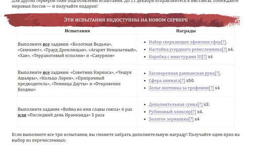 Испытания для всех серверов Для других серверов тоже подготовлены испытания. До 21 декабря отправляйтесь в инстансы, побеждайте мировых боссов — и получайте подарки! https://archeage.ru/news/316712.html# Более подробно на оф.сайте Какие испытания Нас ждут? Выполните все задания: «Болотная Ведьма», «Сехекмет», «Трауд Дремлющая», «Агарит Ненасытный», «Хан», «Терракотовый исполин» и «Сакурион» Награда Выполните все задания: «Советник Кириоса», «Чешуя Ашьяры», «Кольцо Лореи», «Призрачный предводитель»,...