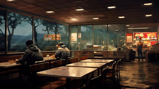 В этот раз покажу, как создать динамичный фон для визуальной новеллы на примере своей игры - The Hungry Town, в сеттинге вампиров как Vampire the Masquarade. За основу беру генерации из нейросети Midjourney по нужному мне запросу. Знаю, что налетят люди с комментами "Нейросети зло и отбирают работу у художников" и т.п. В данном случае нейросеть отнимает работу у меня, а мне и не жалко, я разрешил. Фон для примера - Ночная закусочная Промт для генерации был такой: McDonalds inside, view...