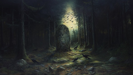 Создано на основе запроса: The raven stone, a glade in a dark forest where the darkness doesn't touch. a large stone, runes at the base, Ravens gathering in the sky. dark fantasy, oil like --- Автоперевод: Камень ворона, поляны в темном лесу, где тьма не трогает...