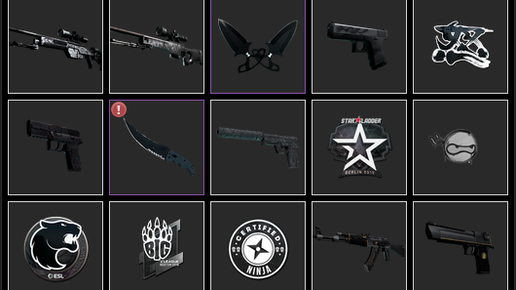 Доброго времени суток! Сегодня я постарался собрать инвентарь для настоящих ниндзя. Минимальная стоимость без ножа ≈ 809 руб Минимальная стоимость с ножом ≈ 6809 руб Итак начнем АК-47 Тут есть два варианта: дорогой и дешевый. Черный глянец. Очень старый скин, был выпущен в 2013 году. При покупке легко можно найти вариант с хорошими стикерами. Цена ≈ 1300 руб (после полевых испытаний) Элитное снаряжение. Относительно новый и недорогой, но от этого не менее черный скин. Цена ≈ 130 руб (после полевых испытаний) M4A4 Есть бесплатный вариант - по дефолту M4A4 черная, но так неинтересно...