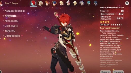 Таланты (созвездия) Лучшие билды для Дилюка Данная сборка направлена на увеличение силы атаки и эффективности стихийных умений героя, чтобы он смог наносить огромные повреждения противникам любого типа. Лучше всего он работает с персонажами поддержками, которые еще сильнее повышают наносимый Дилюком урон, например, Беннетом или Син Цю. Лучшее оружие Лучшие артефакты Для этого героя подойдут два набора артефактов. Первый из них включает в себя полный сет Горящей алой ведьмы. Напомним, что при наличии 2-х предметов у персонажа повышается Пиро урон на 15 процентов...