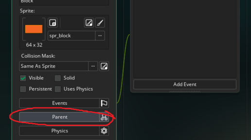 Времени на написание статьи не так много, а читатели очень просят продолжить уроки. Так что продолжу без всяких вступлений. В прошлых уроках мы остановились на том, что научили мяч отскакивать от стен и биты. Пришло время научить его отскакивать от блоков, которые мы должны разбивать (разбивать их мы научимся чуть позже). Для этого достаточно нам добавить всего одно действие. А именно, назначить стену родителем для данного блока. Как это сделать и для чего? Заходим в объект блока. Нажимаем на кнопку "Parent" (что переводится как "родитель")...