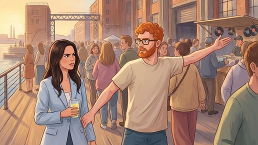 [Глава 3] Рассинхронизация целей. Территория порта бурлила жизнью. Казалось, весь город решил провести этот теплый вечер именно здесь. Люди сидели на газонах, стояли в длинных очередях за бургерами и фотографировались у кирпичных стен с яркими граффити. Пространство было наэлектризовано смехом, громкими разговорами и музыкой. Саша, обычно любивший эту живую атмосферу, сейчас воспринимал толпу исключительно как препятствие. Он маневрировал между хипстерами с собачками и семьями с колясками, крепко держа Ксюшу за руку, словно буксир, тянущий судно через шторм...