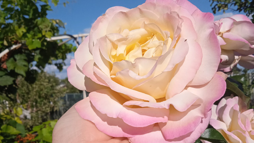 Вот почему так получается? Условия для всех одинаковые, но разница существенная. Причем, это касается не только цветов, но и овощей тоже. Вот эта красотка вымахала за два метра в высоту. Цветки у нее огромные. Роза Акварель ч/г, растет у нас года четыре, но никогда такой гигантской не наростала. Ну, просто стремиться догнать черешню! Даже ее родственница Восточный экспресс, которая славится своим ростом и неприхотливостью, значительно отстала. Заплохела она в это лето. Что уж говорить о Глории Дей, тоже их родственницы...