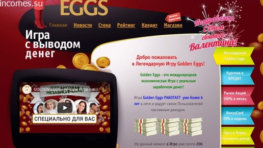 Уже давно ни для кого не секрет, что в интернете можно получать доход просто играя, игра gold-eggs как раз такая. Так как игры с выводом денег много лет в топе способов заработка в интернете. Плюсом такого заработка является то, что в большинстве случаев не требует больших капиталовложений, в отличие от других способов, предлагающихся в интернете. Ещё одним плюсом игр есть и то, что они могут работать по несколько лет.