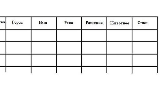 Всем привет. Ну, что мы всё о компьютерных да телефонных играх? А ведь в далёкое время, во времена нашего детства, было множество игр и на улице и дома. А ещё мы собравшись в зале, любили играть в "Города" Очень познавательно, интересно и главное - это соревнования по знаниям друг с другом. Для этого нам понадобятся тетрадные листочки. Каждому по одному. и по ручке. Чертим на листке, такую таблицу как вверху. Так же её заполняем. В середину, но так, чтобы рука с лёгкостью за секунду могла дотянуться...