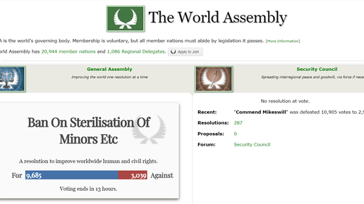 NationStates позволяет вам создать собственное государство (или даже несколько). Смысл игры сводится к принятию, изменению и отмене законов, изучении влияния этих действий на государство и взаимодействию с другими странами. Исходя из принятых вами решений, игра будет высчитывать ваш рейтинг среди остальных государств.