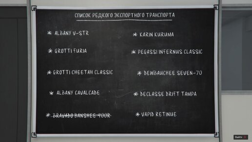 Суть: А теперь отвечаем на вопрос: Что за доска у меня в мастерской? На этой доске написаны названия редких автомобилей которых необходимо доставить,в данном случае это порт. Как найти редкое авто? Ничего сложного в этом нет.Я просто катался по карте и осматривал точки спана этих авто.Но это делать нужно на вертолете...