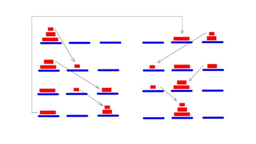 Есть такая классическая задачка, ну или игра: Ханойские башни. Суть в следующем: есть три шеста, на один нанизаны диски, в порядке убывания радиуса. Вроде детской "пирамидки". Два других шеста пусты. Надо перенести диски на другой шест так, чтобы диск диаметром больше не оказался на диске диаметром меньше. Можно использовать третий шест в качестве промежуточного. Вопросы: возможно ли это? Как это сделать, если это возможно? Сколько операций (переносов дисков) понадобится? Задачка известна тем, что она типично рекурсивная...