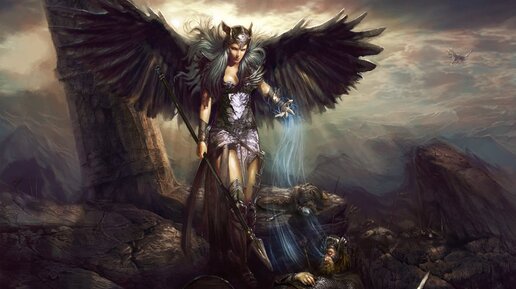 Валькирии ("выбирающие убитых"), в скандинавской мифологии воинственные девы, участвующие в распределении побед и смертей в битвах, помощницы Одина. Первоначально валькирии были зловещими духами сражений, ангелами смерти, получавшими удовольствие от вида кровавых ран. В конном строю проносились они над полем боя, словно стервятники, и именем Одина вершили судьбы воинов. Избранных героев валькирии уносили в Вальхаллу - "чертог убитых", небесный лагерь дружинников Одина, где те совершенствовали свое военное искусство...