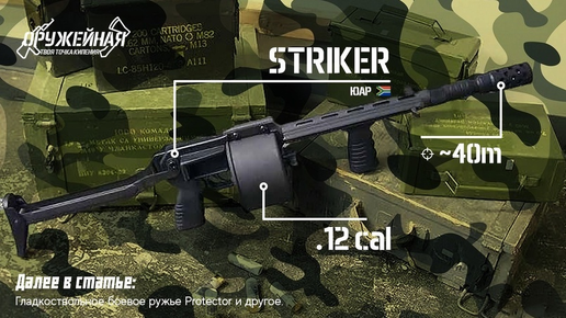 Гладкоствольное боевое ружье Striker было разработано жителем Родезии Хилтоном Уолкером в начале 1980-х годов. После падения Родезии Уолкер переехал в Южно-Африканскую республику, где продолжил свою работу над оружием. Первые образцы боевого дробовика его конструкции были выпущены в середине 1980-х в ЮАР, и предназначались для полицейских и военных операций, требовавших большой огневой мощи на малых дальностях стрельбы. Оружие конструкции Уолкера отличалось большой емкостью магазина (12 патронов...