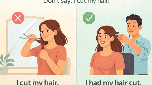 💇♀️ Вы сами стрижёте себе волосы? Нет? Тогда не говорите "I cut my hair"! Разбираем конструкцию для ситуаций, когда вам оказывают услугу. 🤔 В ЧЁМ ПРОБЛЕМА? Неправильно: ❌ I cut my hair yesterday. (Я сам себе подстриг волосы вчера) ❌ I repaired my car. (Я сам починил машину) ❌ I cleaned my teeth. (Я почистил зубы — это правильно, если сами!) Но если вам делали это в салоне/сервисе: ✅ I had my hair cut yesterday. (Мне подстригли волосы) ✅ I had my car repaired. (Мне починили машину) Разница:...