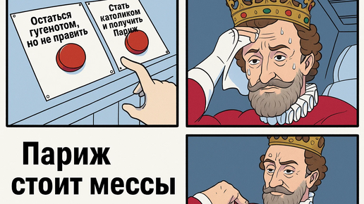 В XVI веке во Франции, как и в Германии, стал популярен протестантизм, а именно — кальвинизм. Французских протестантов называли гугенотами. Страна раскололась на два лагеря: После того, как король Генрих II нелепо погиб на рыцарском турнире, к власти пришли его слабые сыновья. За их спиной всем заправляла хитрая королева-мать Екатерина Медичи. В 1562 году люди герцога Гиза напали на молящихся гугенотов в местечке Васси. Это стало искрой, которая разожгла пламя религиозных войн, продолжавшихся более 30 лет...