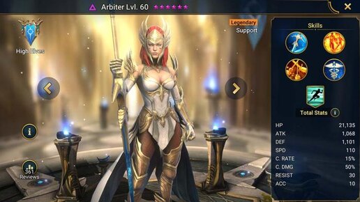 Арбитр - это Легендарный герой фракции Высших Эльфов. Получить героя можно за выполнение линейки миссий в игре. У нее фантастический набор навыков, которые большинство людей используют на Арене и Подземельях и она будет продолжать использоваться вплоть до конца игры. У Арбитра одна из лучших аур на скорость в игре на Арене и часто считается лучшим ускорителем на Арене. Также у нее есть воскрешение всей команды, ускорение шкалы хода и лечение, что очень поможет в таких подземельях как Ледяной Голем, Дракон, Лавовый рыцарь, а также в Войнах Фракций...