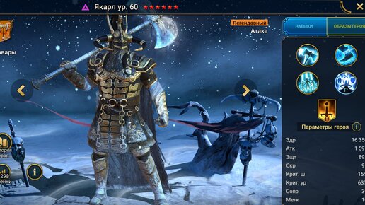 Якарл гайд на героя. В этом гайде мы рассмотрим героя Якарл, которого могут получить все игроки, выкупив его частицы в клановом магазине. Якарл - Легендарный герой атаки тёмной стихии из фракции Варвары. Навыки: 1. Зимний топор - Атакует врага 2 раза. Каждый удар с вероятностью 40%(с книгами 50%) накладывает заморозку на 1 ход. Игнорирует 25% защиты цели, если та находится под действием Заморозки. Урон зависит от АТК. 2. Повелитель бури - Атака по врагу. С вероятностью 75%(с книгами 100%) накладывает Штраф скорости 30% на 3 хода и Заморозку на 1 ход...