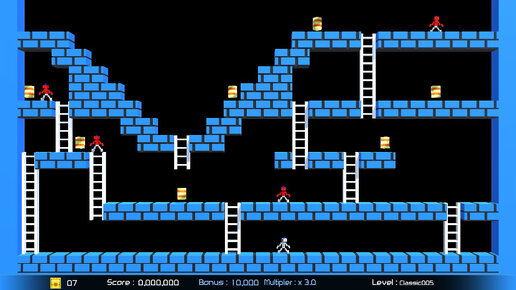 Страшно поверить, но бежит он уже 35 лет. Впервые игра была представлена общественности в далеком 1983г. Это был родоначальник целого жанра подобных игр. Игрок управляет маленьким человечком и должен собрать всё золото, лежащее на данном уровне, избегая встречи с роботами. Весь уровень целиком виден на экране и состоит из кирпичных платформ, лестниц, а также натянутых верёвок, по которым можно двигаться, держась за них руками. Персонаж игры не может убивать роботов, но может создавать для них ямы в кирпичном полу — попавший в яму робот задерживается там на некоторое время...