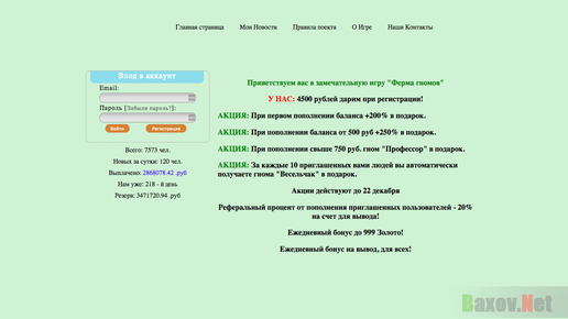 Ферма гномов представляет собой некую платформу для заработка денег, в режиме онлайн. Проект позволяет пользователю окунуться во времена, когда была золотая лихорадка. Как тогда, так и сейчас человек может заработать приличную сумму денег за короткое время при минимальных вложениях. Правила игры заключаются в найме гномов, которые будут приносить владельцу аккаунта стабильный доход. Известные названия Ссылки на проект E-mail адреса проект Связаться с администрацией при возникновении каких либо вопросов возможно посредством обратной связи, другого способа на ресурсе не предусмотрено...